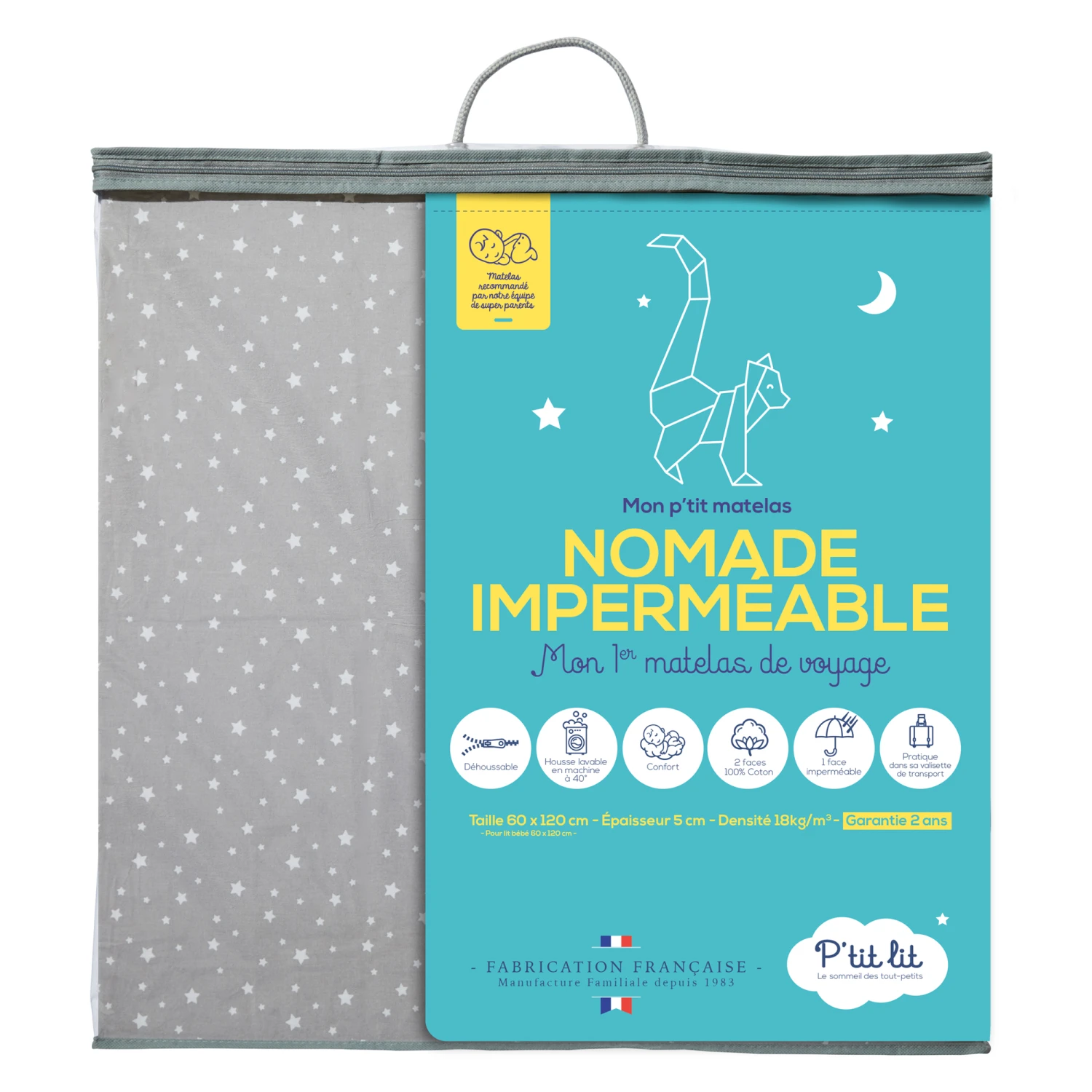 Matelas de voyage Nomade 60x120cm, 100% coton, imperméable, pratique avec sa valisette de transport. Idéal pour les bébés qui voyagent. Facile à installer et à ranger! Les deux faces de la housse sont en 100% coton, pour que l’approche de bébé soit douce et confortable. La face blanche, en bouclette éponge, est imperméable, microrespirante et silencieuse. Epaisseur de 5 cm, idéale pour le confort de bébé. Matelas réversible, déhoussable et lavable en machine, pour une hygiène parfaite! Garantie 2 ans. Fabrication française.