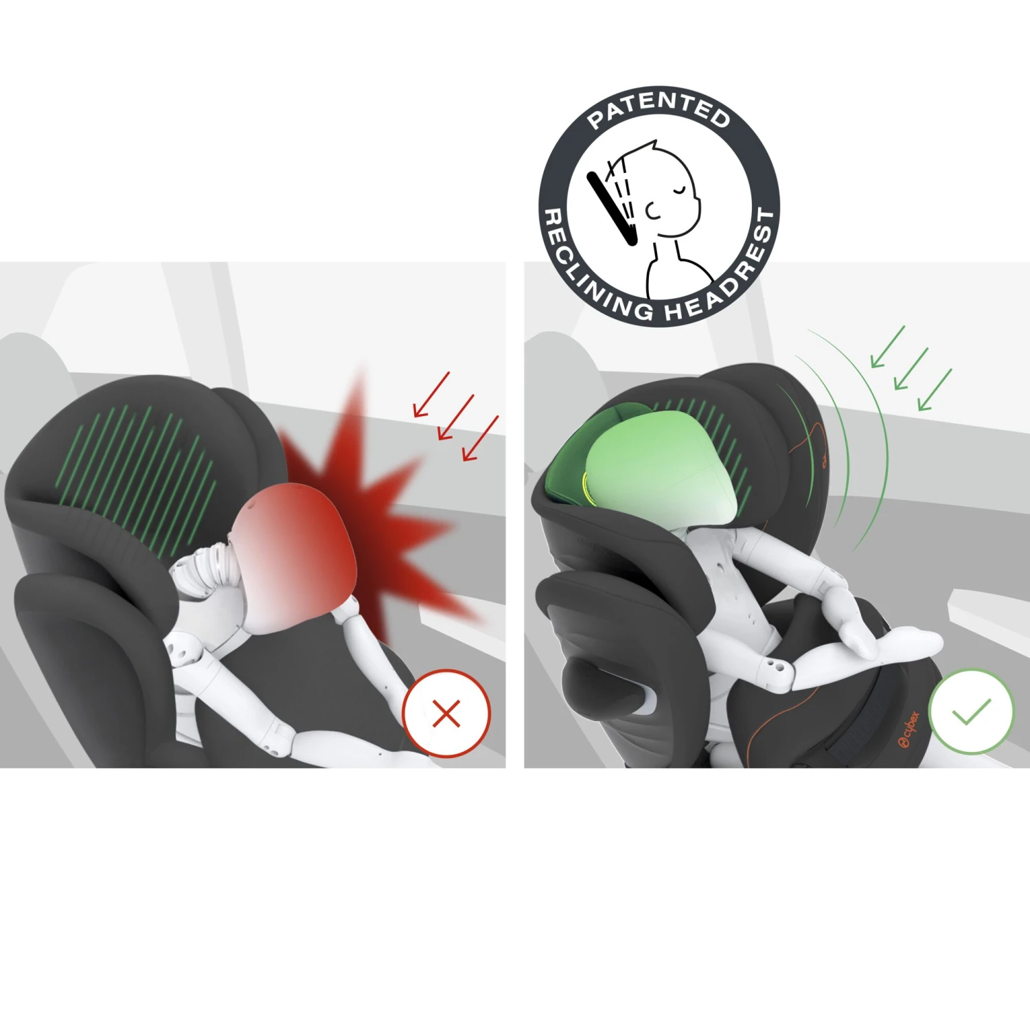 Pour l’accompagner durant ses premières années, CYBEX développé un bouclier d’impact qui assure protection, confort et liberté de mouvement durant tous les trajets en voiture. L’appui-tête inclinable breveté CYBEX protège la tête de votre enfant, même quand celui-ci s’endort.